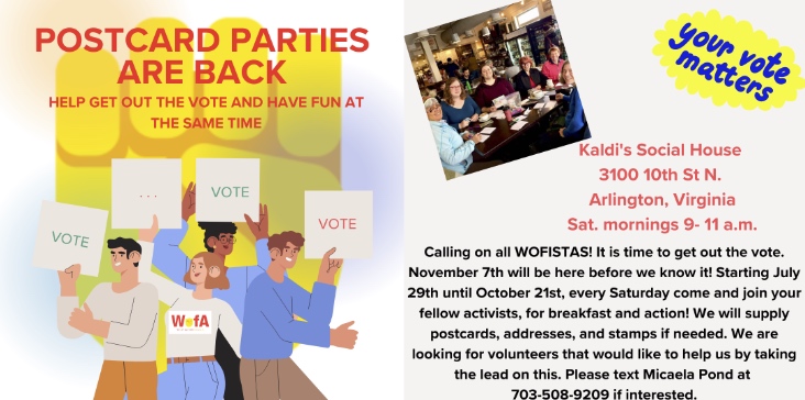 Saturdays, 9:00am – 11:00am, Kaldi’s Social House, 3100 N 10th St, Arlington In-Person Postcard Parties are Back! Postcard Parties are back! Starting this Saturday at Kaldi’s Social House in Arlington. How do postcard parties work? Come join your WofA friends anytime between 9 a.m. and 11 a.m. We will have a table with postcards, scripts, and addresses. Write as many or as few as you want. Messy handwriting? No problem, you can be a proofreader, or help us put the stamps on. We know that personal postcards are effective, especially for buildings and rural areas that are hard to canvass. Come give it a try and meet some fellow activists who know how important this election in November is going to be! WOFA is looking for someone who could take the lead on this project going forward. Not much is entailed in this but being able to commit to some Saturdays so that we know we have it covered. Ideally one to three folks. if you are interested in taking the postcard lead for a couple of Saturdays and also if I you plan on attending this Saturday, please text Micaela at: 703-508-9209