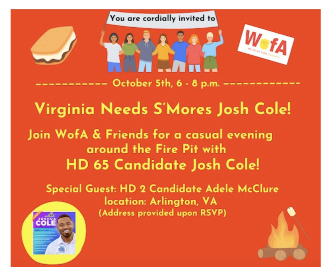 Thurs, Oct 5th, 6-8pm – Outdoors Josh Cole Fundraiser – Arlington, VA Please join WofA & Friends on Thursday, October 5th from 6:00 pm to 8:00 pm for a fun event in support of HD 65 Candidate Joshua Cole – with special guest Adele McClure. During our casual evening around the firepit you’ll hear Josh talk about his race and what is at stake this November. There will be S’mores and other tasty treats and libations! Joshua Cole is running again for the House of Delegates in the newly drawn 65th District – if we want to regain a Democratic majority in the House, the 65th District is a must-win in 2023! RSVP Here:https://secure.actblue.com/donate/wofa-jc2023