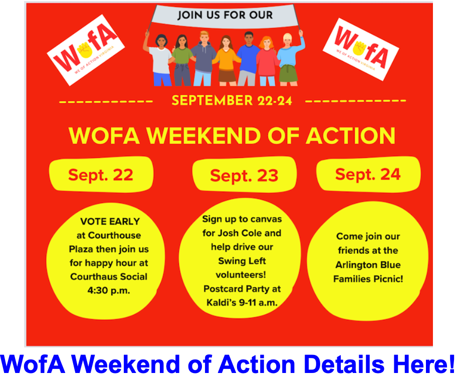 Tuesday, September 19th, 6:45pm – 7:45pm WofA Monthly Membership Meeting – with Dan Helmer & Lily Franklin Please join WofA & Friends for a jam packed meeting with Actions; Activities and Information on Virginia’s upcoming November Elections. Rep Dan Helmer will be on hand to give us the latest on how the many closely contested races are looking. We’ll also have loads of information on various opportunities for you to make a difference! Zoom Link: https://us02web.zoom.us/j/89593333404